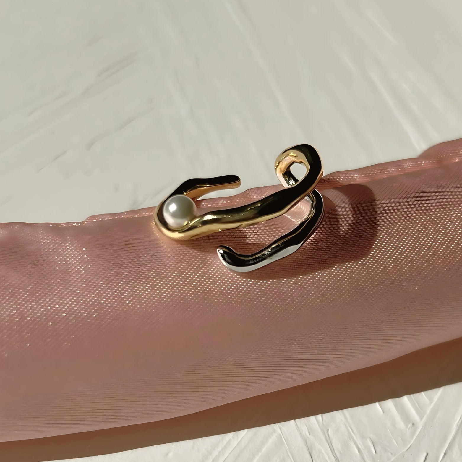 This elegant wrap-around ring features a delicate band in both silver and gold tones, gracefully hugging the finger like a string. Finished with a luminous imitation pearl, it blends softness and sophistication, making it the perfect statement of modern femininity.